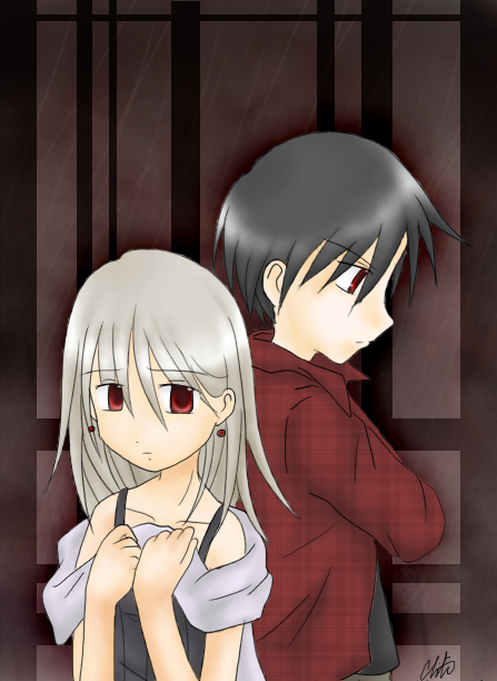 about: A rather dark picture of Kamin and Mia. The background wasn't planned ahead, so the lighting is a bit off, but I like how the overall mood of the pic came out. :)