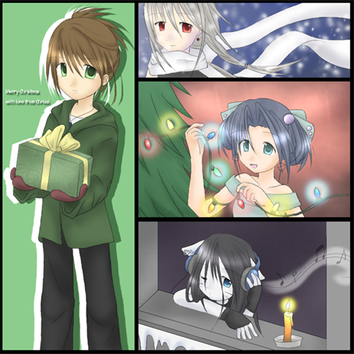 about: Drawn for the holiday season of 2004. All four girls are my characters. (Left: Lina | Right, from top to bottom: Mia, Corinne, Snow)
