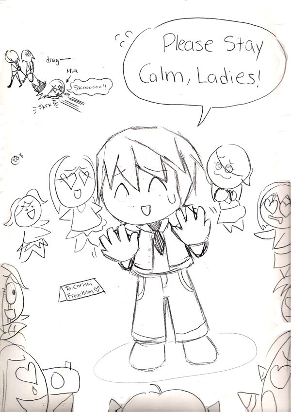 about: Silly doodle of Shino, Mia, and aggressive students fangirls. I shouldn't be too happy to see my protagonist being dragged away, but it's cute! x]